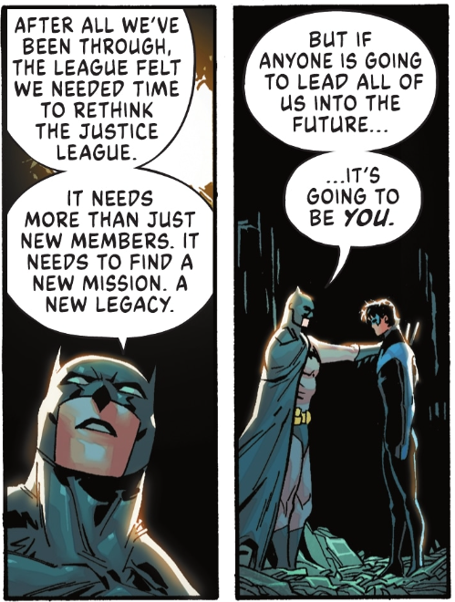 Page 29 – Panels 3 and 4: Batman confirms the League has disbanded and they are entrusting the future of the heroes to Nightwing and the Titans.