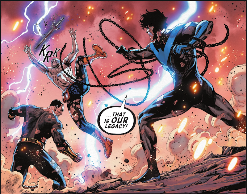 Page 9 – Panel 4: As Black Adam attacks Deathstroke in the real world, Nightwing takes on Deathstroke in the darkness.