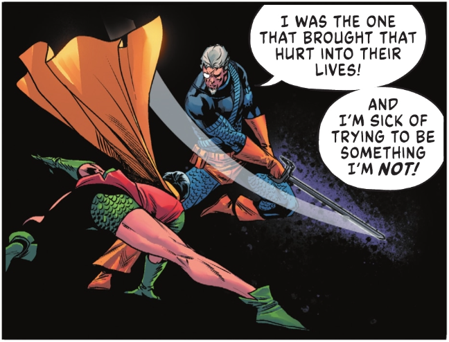Page 18 – Panel 3: And Deathstroke tries to justify what he did.