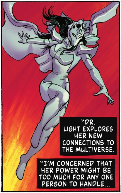 Page 20 – Panel 4: Dr Light enjoying her new connections to the multiverse while Mr Terrific’s narration shows some concern.