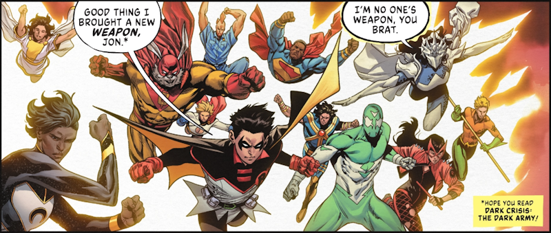 Page 7 – Panel 3: Robin arrives with Justice League Incarnate, as seen at the end of DARK CRISIS: THE DARK ARMY, covered in Crossovers Part 6. Across the top row (mostly in the air) are Mary Marvel (Earth 5); Captain Carrot (Earth 26); Dino-Cop (Earth 41); President Superman (Earth 23); and Dr Light. Along the bottom (mostly on the ground) are Doctor Multiverse (Earth 8); Power Girl; Robin; Thunderer (Earth 7); Sideways; Red Canary; and Aquawoman (Earth 11). The weapon Robin refers to is the newly powered-up Dr Light.