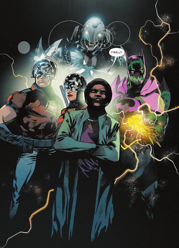 Page 36: Waller stands fully revealed before Peacemaker on the left, Peacewrecker beside him, the armored creature Bright behind them, and an as yet unamed Batman/Yellow Lantern/Bizarro/Joker amalgamation.
