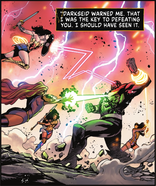 Page 9 – Panel 2: Anti-clockwise from the top left are Wonder Woman; Starfire; Queen Nubia; Darkseid; and Wonder Girl. Black Adam’s narration says Darkseid warned him that he “was the key to defeating [Deathstroke]” which is a generous interpretation of Page 21 – Panels 3 and 4 of JUSTICE LEAGUE #75.