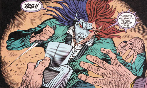 Page 17 – Panel 3: As mentioned above, at this time Bruce thinks that Eclipso is nothing more than his own evil half rather than an entity in his own right.