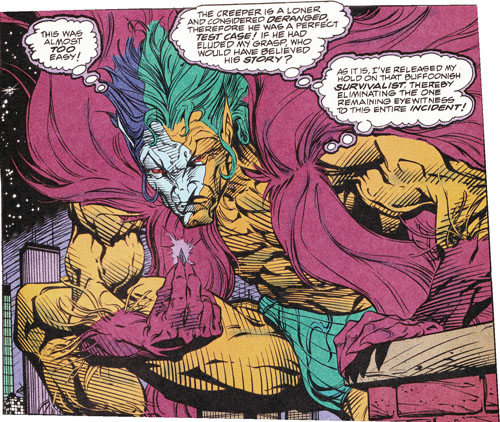 Page 39 – Panel 1: . . . becomes eclipsed. The Creeper becomes the second hero to fall, a test case for Eclipso to judge how easily he can possess the superheroes of Earth.