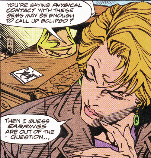 Page 26 – Panel 4: Mona verbalises the new regime regarding the black diamonds – that it now only takes physical contact to call up Eclipso.