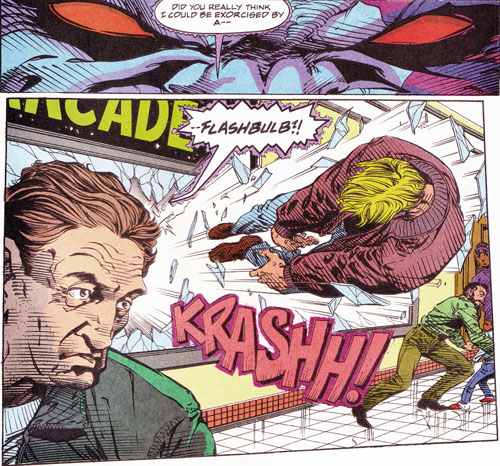 Page 47 – Panels 1 and 2: This time, however, Eclipso simply shrugs it off and hurls Gordon through the arcade window.