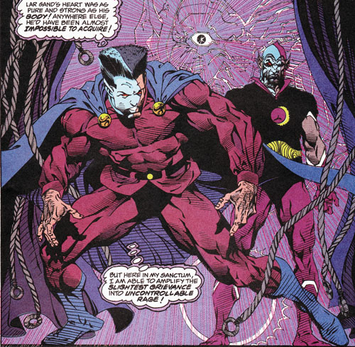 Page 12: . . . the villain of the piece, whose palace Lar Gand has wandered into Eclipso. Technically, this is Eclipso’s first appearance in this form; prior to this, he was believed to be the evil side of Dr Bruce Gordon (whom we’ll meet soon) rather than a character in his own right. This series (along with later revelations in THE SPECTRE) retconned his origin and revealed him to be more powerful than previously thought.