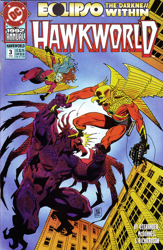Hawkman becomes angry with himself for not being where he was needed and manifests an Eclipso creature that begins to beat him until the dawn forces it to retreat. Hawkman confronts Dr Kaslak who admits to sending the diamond to Hawkwoman and tells Hawkman what he knows of Eclipso.