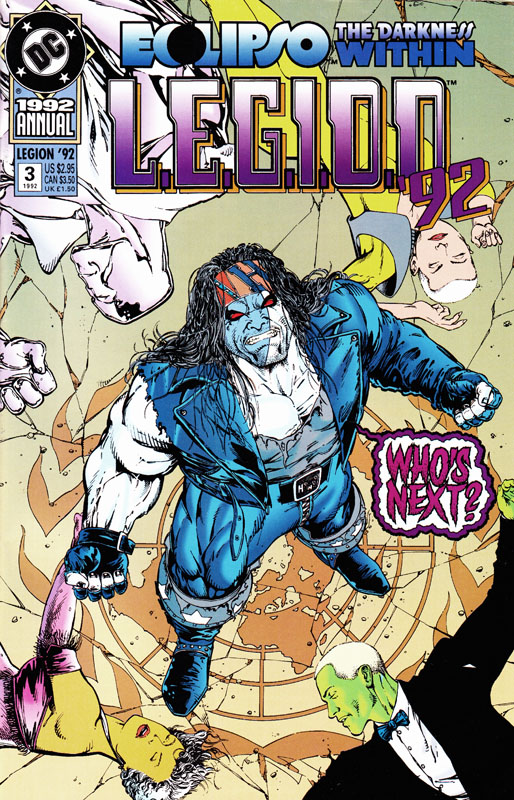 Heroes from LEGION and the Justice League as well as others battle Superman in order to distract him as Metamorpho transforms himself into lava in order to increase the pressure in the volcano. The resulting eruption spits Superman out into the air but too late as by then the sun has set. As Lobo fights on, many of the other heroes look to save the native islanders from the lava that is set to burn their village. Vril Dox berates Guy Gardner who had furnished himself with Sinestro’s yellow power ring since the events of GREEN LANTERN ANNUAL #1, telling him he could fly to the sun and return with enough burning gas to expel Eclipso. Annoyed, Gardner flies off.