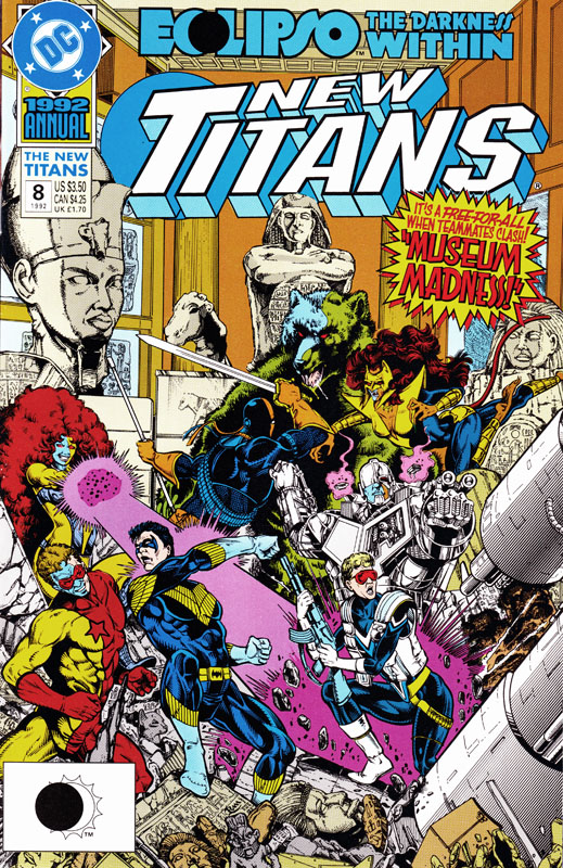 Nightwing, Deathstroke and Vigilante follow Cyborg’s internal signal and track him to the Brooklyn Museum figuring the eclipsed Titans are using him as a guard during the day. He attacks them at the same time that Alderman’s robot returns after having repaired itself. Cyborg and the robot face off as Nightwing finds his team mates before they in turn attack him and the others, Deathstroke succumbing to Eclipso and inadvertently destroying the robot. Believing Nightwing and the Vigilante to be dead in the rubble of the museum, Deathstroke and the eclipsed Titans escape.