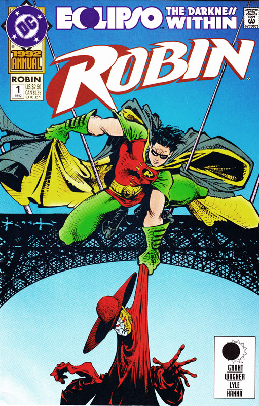 The villain Anarky breaks into the home of the artist who created the headpiece as seen in DETECTIVE COMICS ANNUAL #5 (see above) and demands the remaining black diamonds the artist has. Robin arrives after Anarky leaves and learns he now has five black diamonds. Chased by Robin, Anarky uses one of the diamonds, giving it to a man railing at the banking system, allowing him to generate an Eclipso creature which Robin deals with using a solar gun.