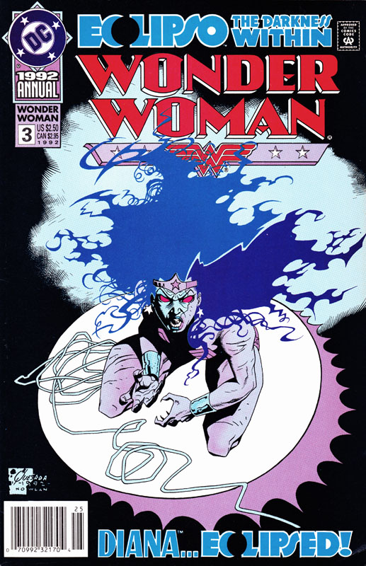 All too soon, the eclipsed Diana breaks free and rampages through the house trying to find Randolph. She captures Cassie and almost kills her before casting her aside and, when she has Randolph in her sights, she allows him to slip through her fingers before flying off, heading to the moon. Cassie comments that it seems likely the real Diana is still within herself, battling Eclipso, preventing him from killing them.