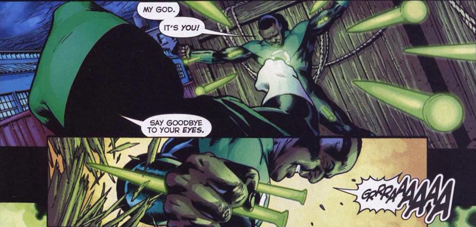 Page 18 – Panel 3: Stewart recognises his attacker, a fellow Green Lantern who appears to be mimicking Hal Jordan’s costume (thanks to Stuart Kinsella for pointing that out.)