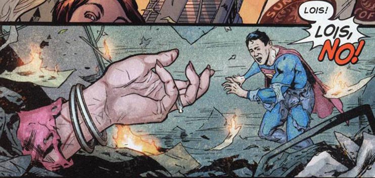 Page 26 – Panels 2-3: On Page 13, Libra had seemed to take up Luthor’s challenge to hurt Superman. Here, knowingly or otherwise, it appears he has done so by blowing up the Daily Planet and seemingly killing Lois Lane.