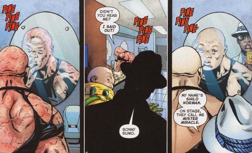 Page 8 – Panels 1-3: As Norman meets Sonny Sumo, the sound of Ping, Ping, Ping can be heard – this is Norman’s Motherboxxx (formerly called a Mother Box). It is this device, common to many of the New Gods, that heals the burns Megayakuza caused on Sumo.
