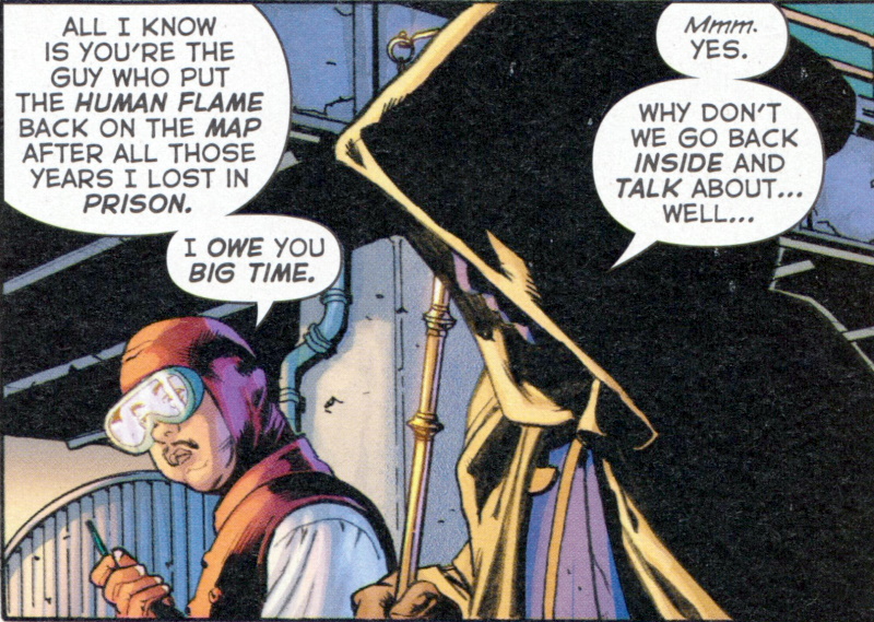 Page 14 – Panel 5: It seems unlikely that the Human Flame is going to come out of his deal with Libra in a good way.