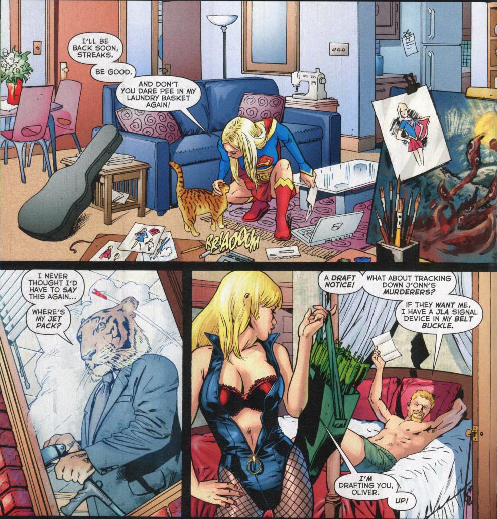 Page 17 – Panel 3: Black Canary and Green Arrow. Arrow mentions the murder of J’onn J’onnz who was killed by Libra in issue #1 and whose death was elaborated upon in REQUIEM. I’m a little surprised at Black Canary’s choice of underwear; I would have thought something more practical such as a sports bra would have been a smarter choice . . . not that I spend that much time thinking about her underwear . . .