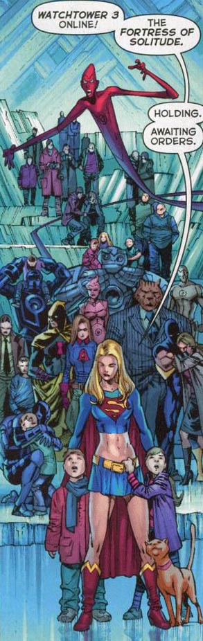 Page 14 – Panel 2: At the Fortress of Solitude several heroes and civilians are hiding out. From top to bottom are Mercury; then Lead, Iron and Gold in a row with Copper in front of them (thanks to Michael for pointing that out); Hourman, Liberty Bell, Mr. Tawky Tawny and Damage; Blue Beetle knelt consoling someone; Supergirl in front. Bearing in mind that the Daily Planet is being produced here, it’s possible some of the civilians are staff members – just below Mercury’s right arm is someone holding a camera which could be Jimmy Olsen but they’re too indistinct to say for certain.