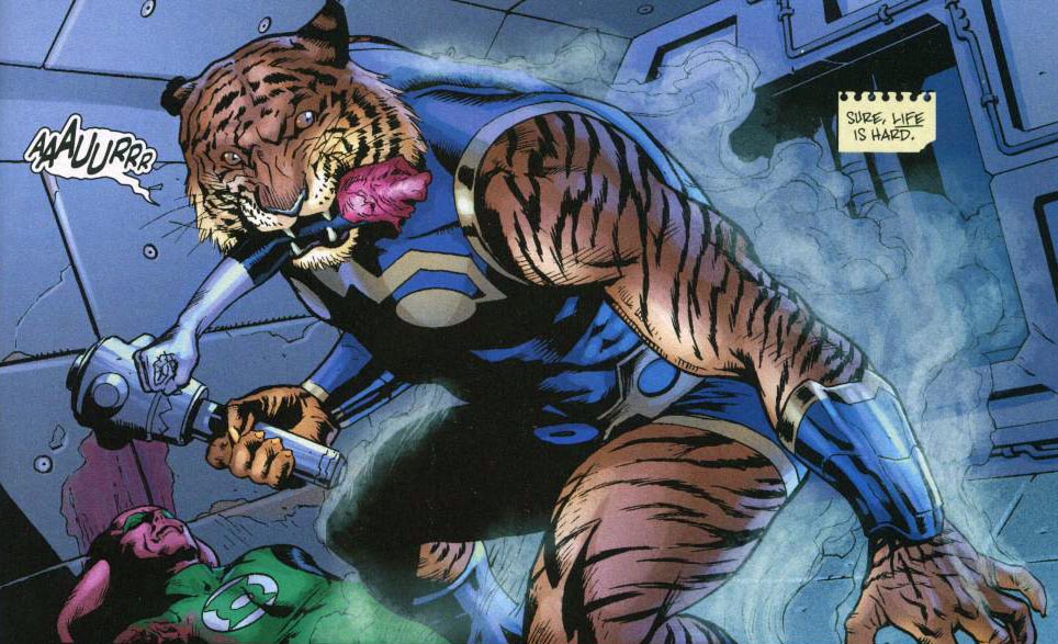 Page 9 – Panel 1: His new body is obviously the tiger that was being worked on in issue #2. He’s also killed a Green Lantern who is probably Opto309v who appeared with John Stewart in issue #2 though I’m not entirely sure due to the slight difference in skin colour. Oh, and I know I’m being picky here but the Lantern’s arm in Panel 1 is definitely his right arm; in Panels 3 and 4 it’s his left.