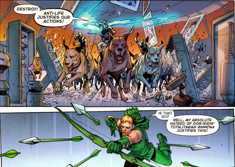 Page 21 – Panel 1: “I’ll use the anti-Anti-Life arrow.” Green Arrow rocks.