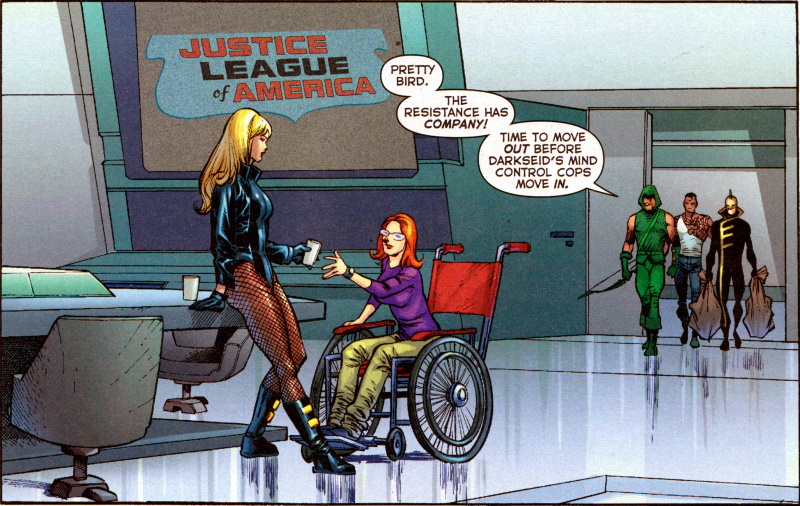Page 5 – Panel 1: Leaning on the table is current head of the Justice League and Green Arrow’s wife, Black Canary; “Pretty bird” has long been his nickname for her. Seated in the wheelchair is Oracle who was previously Batgirl. She’s Barbara Gordon, daughter of Gotham’s Commissioner Gordon.