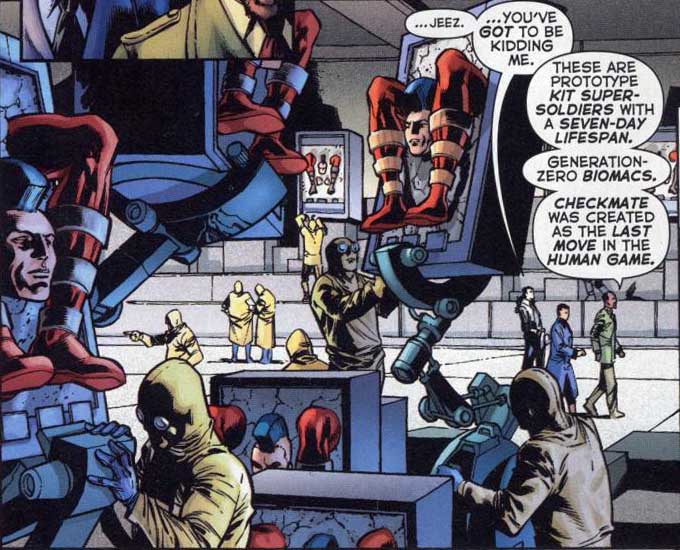 Page 7 – Panel 1: In Checkmate castle, The Question (at the top of the stairs), Amanda Waller (next one down) and Taleb Beni Khalid discuss the arrival of Überfraulein or Overgirl, the Supergirl analogue from another universe who arrived in the early pages of issue #3. Off to one side there appears to be an autopsy of one of the Justifiers taking place.