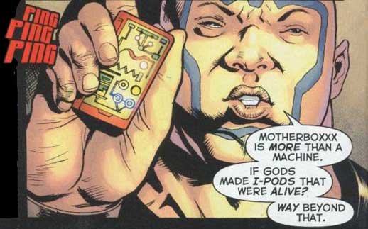 Page 11 – Panel 6: Sonny Sumo holds a Motherboxxx, the latest version of the New Gods’ living technology.