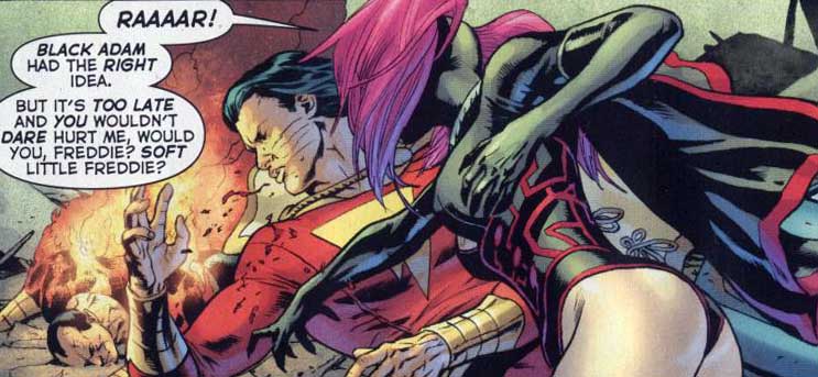 Page 20 – Panel 1: As Captain Marvel flies in, Black Adam beats Mary who seems to enjoy it.