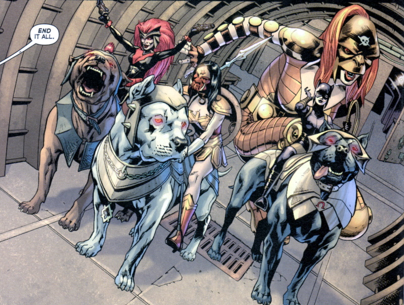 Page 8 – Panel 2: Transformed into the new Female Furies, this is Wonder Woman, Batwoman and (sitting down) Catwoman.