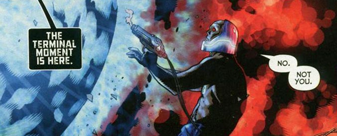Page 11 – Panel 6: Darkseid is confronted by the Black Racer. Note the smoking gun in Darkseid’s hand.