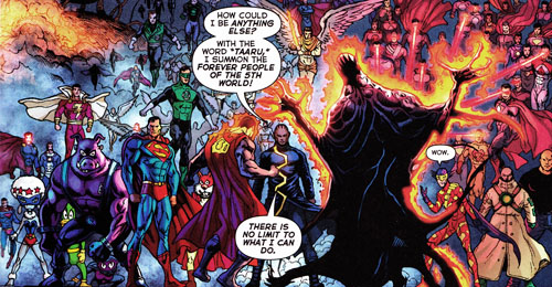 Page 28 – Panel 3: The Superman face off against Mandrakk, joined by the Pax Dei behind them; to the left of Superman is Yankee Poodle; next to Nix Uotan is Pig Iron and Captain Carrot himself.