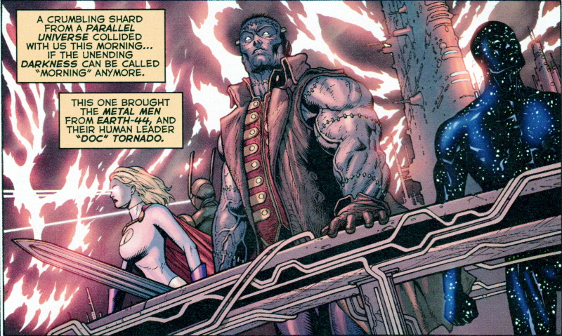 Page 5 – Panel 2: Heroes standing guard: Power Girl on the left; Iman behind her; Frankenstein; and Starman. The narrator, Lois Lane, tells of the Metal Men from Earth-44 and their human leader, Doc Tornado.