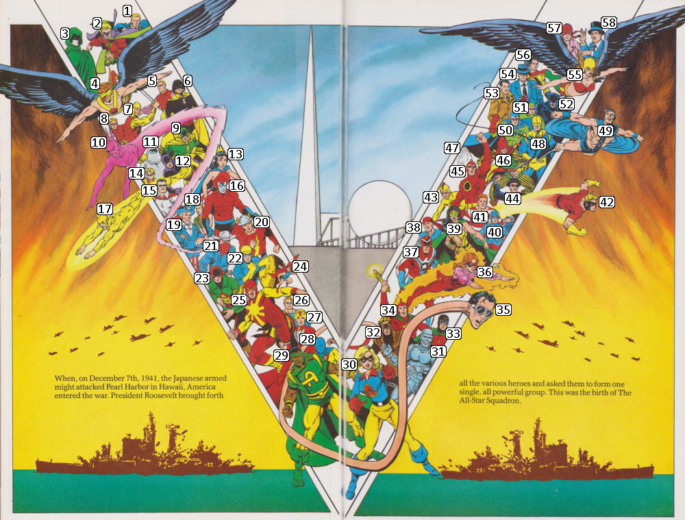 1) Magno 2) Green Lantern 3) The Spectre 4) Hawkman 5) Red Bee 6) Hourman 7) The Shining Knight 8) Red Torpedo 9) Air Wave 10) Thunderbolt 11) Human Bomb 12) Sandman 13) Miss America 14) Sandy The Golden Boy 15) Mr. America 16) Manhunter (Paul Kirk) 17) The Ray 18) Johnny Thunder 19) Uncle Sam 20) The Flash 21) The Vigilante 22) The Guardian 23) Mr. Terrific 24) Doll Man 25) Judomaster 26) Manhunter (Dan Richards) 27) Sargon The Sorcerer 28) The Atom 29) Amazing Man 30) Liberty Belle 31) Robotman 32) Tarantula 33) Dr Mid-Nite 34) Starman 35) Plastic Man 36) Firebrand (Danette Reilly) 37) Steel 38) Neon The Unknown 39) Phantom Lady 40) Star-Spangled Kid 41) Stripesy 42) Johnny Quick 43) Wing 44) The Whip 45) Crimson Avenger 46) The Jester 47) Invisible Hood 48) Dr Fate 49) Black Condor 50) TNT 51) Dan the Dyna-Mite 52) Wildcat 53) Dr Occult 54) Midnight 55) Hawkgirl 56) The Spider 57) Firebrand (Rod Reilly) 58) Zatara