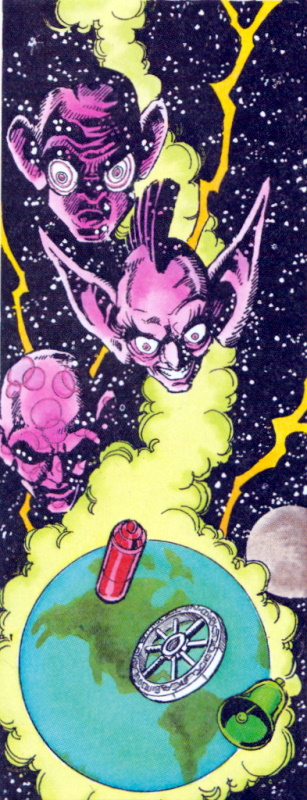 Page 4 and 5 – Panel 7: The Demons Three, foes of the Justice League of America. Top to bottom are Abnegazar, Ghast, and Rath. Below them are the Red Jar of Calythos, the Silver Wheel of Nyorleth, and the Green Bell of Uthool, the three mystical items used to imprison the demons.