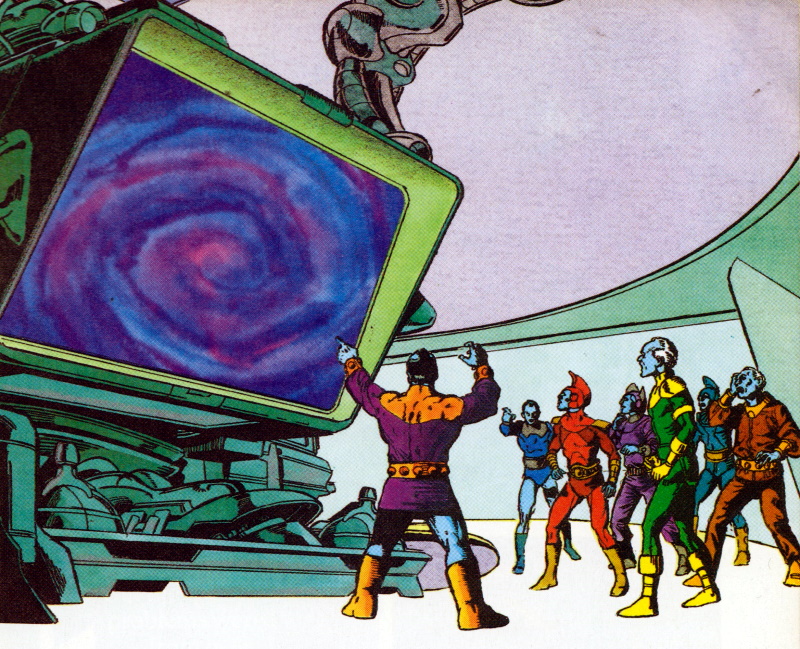 Pages 4 and 5 – Panel 6: The Psions are banished to the Vega system by the Guardians of the Universe. There, they became long time antagonists of the Omega Men among others.