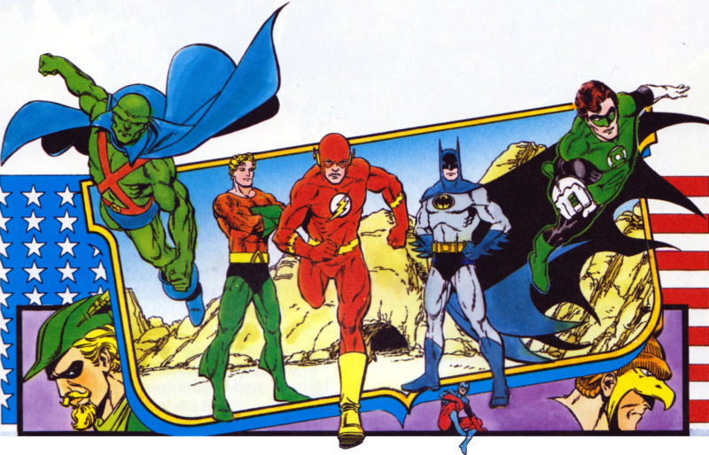 Page 17 – Panel 1: The Justice League of America shown above. Left to right are Green Arrow; Martian Manhunter; Aquaman; the Flash; Batman; Atom (beneath Batman); Green Lantern; and Hawkman.