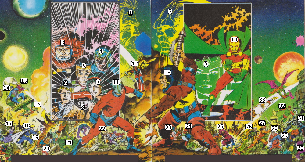 Pages 22 and 23: The New Gods of New Genesis and Apokolips. The image below is numbered but instead of going left to right, I’ve broken it up into sections with the key below the image.