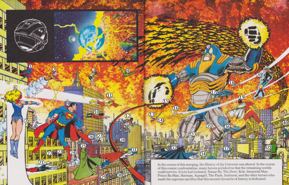 Pages 34 and 35 main spread: Shown above is the Crisis on Infinite Earths, pre-Crisis, hence Harbinger’s mention of multiple Earths.