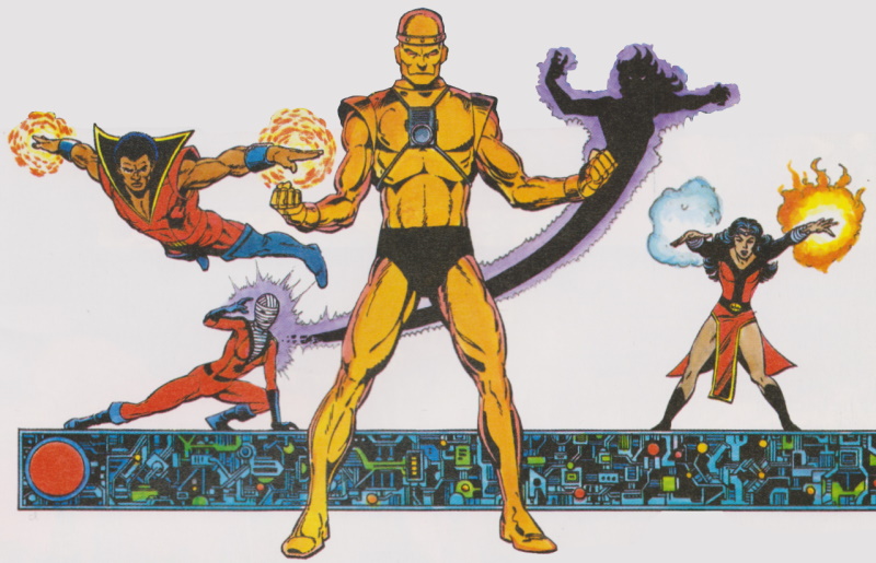 Panel at the centre of the left page: 3) Big Bear 4) Vykin the Black 5) Mark Moonrider 6) Serifan 7) Beautiful Dreamer; together these are the Forever People and they can combine to form 8) Infinity Man