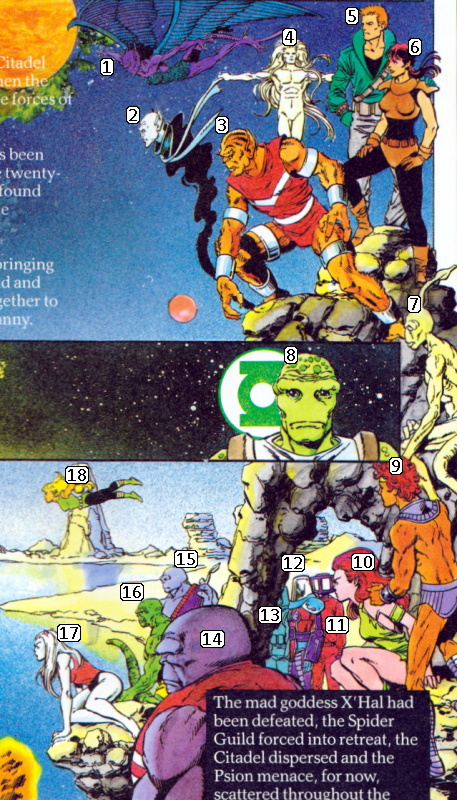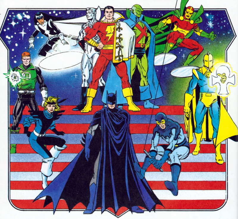 1) Star-Spangled Kid 2) Metamorpho 3) Jade 4) Beast Boy 5) Anti-Monitor 6) Harbinger 7) Hourman 8) Tin 9) Superman 10) Wonder Girl 11) Firestorm 12) Cyborg 13) Hawkman 14) Hawkgirl 15) Elongated Man 16) Lady Quark 17) Blue Beetle’s Bug 18) The Ray 19) Captain Marvel 20) Halo 21) Captain Atom 22) Katana 23) Geo-Force 24) The Question 25) Pariah 26) unknown but Jemm Son of Saturn has been suggested 27) Nightwing 28) The Creeper 29) Hawk 30) unknown but Human Bomb has been suggested 31) Power Girl 32) Batman 33) unknown but Blok has been suggested 34) Martian Manhunter 35) unknown but Tempest of the Doom Patrol has been suggested 36) Black Condor 37) The Atom 38) Vixen 39) Green Arrow 40) Uncle Sam