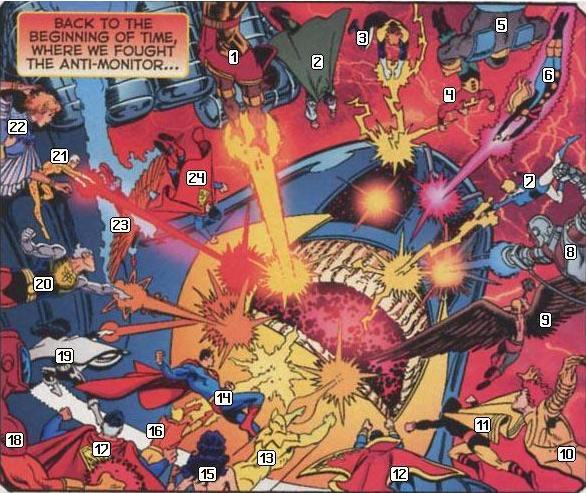 Page 16 – Panel 5: The final battle against the Anti-Monitor condensed to one panel and reminiscent of the cover of CRISIS ON INFINITE EARTHS #12.