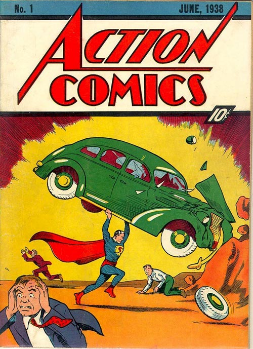 Page 14: Kal-L picks up a car and rams it into Superman. This image is a direct homage to the cover of ACTION COMICS #1 (shown on the left) that launched Superman on to the world. Note the similarity in style of car and even the left headlight in both pictures has sprung free above the hood of the car.