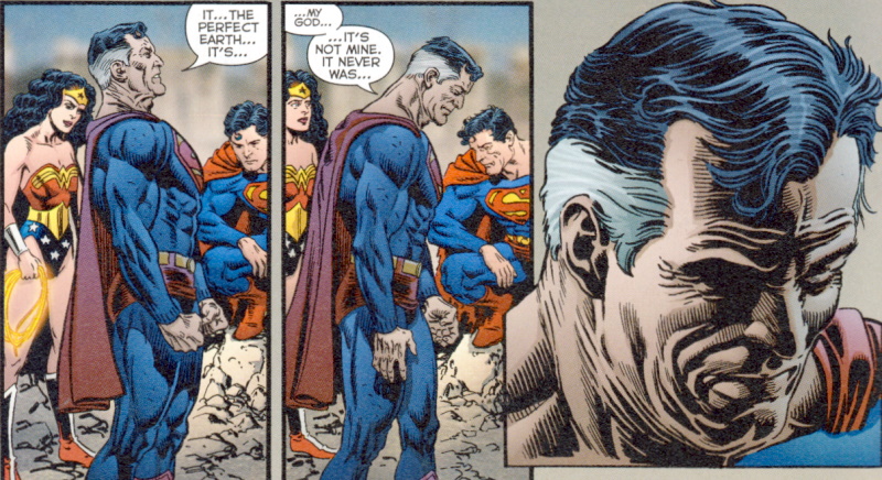 Page 20 – Panel 5: Superman pop’s Kal-L’s argument, refuting the idea that Earth-2 is perfect. After all, as he says, what need is there for a Superman in a perfect world?