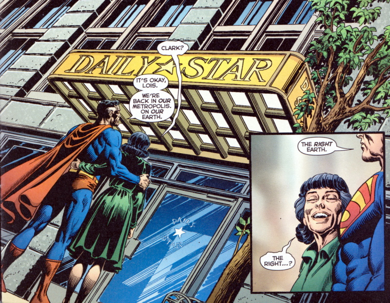 Page 3 – Panel 5: Kal-L and Lois stand in front of the Daily Star offices in Metropolis on Earth-2 having been transported there like the others at the end of the previous issue.