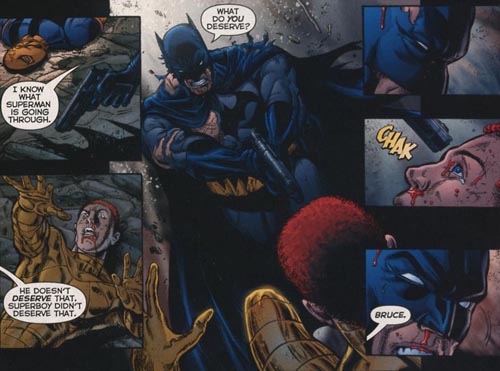 Page 13 – Panels 1 to 3: Back on Earth, Batman defeats Deathstroke while Nightwing and Robin look on. That these three could defeat Deathstroke contradicts IDENTITY CRISIS where Deathstroke is shown defeating the Justice League single-handed.