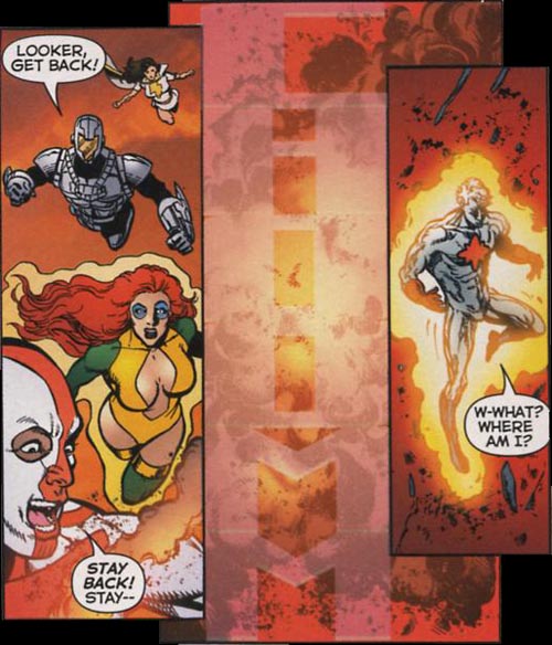 Pages 6 and 7 – Panel 7: After a severe beating in which the monster’s jaw is torn off, Doomsday collapses in front of Firehawk, Mercury and Lead. Behind them are Platinum (bottom left, below Mercury’s arm) and Gold (top right, above Mercury’s arm.)