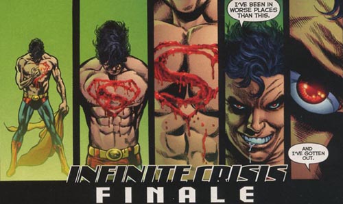 Page 36 – Panels 8 and 12: Superboy-Prime, clearly mad, carves a Superman symbol into his own chest and swears to escape. The bloody S symbol is very similar to the symbol used by DC during the Death of Superman storyline.