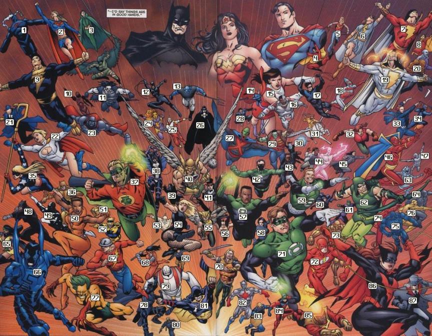 1) OMAC 2) Supergirl 3) Enchantress 4) Robin III 5) Wonder Girl 6) Mary Marvel 7) Captain Marvel Jr 8) Speedy 9) Black Adam 10) Steel 11) Lobo 12) Catwoman 13) Blue Devil 14) Nightmaster 15) Elasti-Girl 16) Cyborg 17) Nightwing 18) Bulleteer 19) Captain Marvel 20) Metamorpho 21) The Question 22) Power Girl 23) Steel 24) Starfire 25) Adam Strange 26) Phantom Stranger 27) Martian Manhunter 28) Detective Chimp 29) Frankenstein 30) Klarion 31) Shining Knight 32) Grace Choi 33) Captain Boomerang 34) Ravager 35) Stargirl 36) Catman 37) GL Alan Scott 38) Huntress 39) Human Bomb 40) Hawkman 41) Zatanna 42) Ion 43) Mr Terrific 44) Jakeem Thunder and Thunderbolt 45) Renee Montoya 46) Red Tornado 47) Tin 48) Wildcat 49) Starman 50) Vixen 51) Skeets 52) Booster Gold 53) The Ray 54) Black Canary 55) Hawkman 56) Black Condor 57) GL John Stewart 58) Sasha Bordeaux 59) GL Guy Gardner 60) Raven 61) Beast Boy 62) Green Arrow 63) Platinum 64) Lead 65) Phantom Lady 66) Blue Beetle 67) Flash 68) Manhunter 69) Doll Man 70) Aquaman 71) GL Hal Jordan 72) Flash 73) Robotman 74)Mercury 75) Iron 76) Gold 77) The Creeper 78) Dr Mid-Nite 79) STRIPE 80) Sand 81) Hourman 82) Captain Atom 83) Manhattan Guardian 84) The Atom 85) Firestorm 86) Batwoman 87) Uncle Sam.