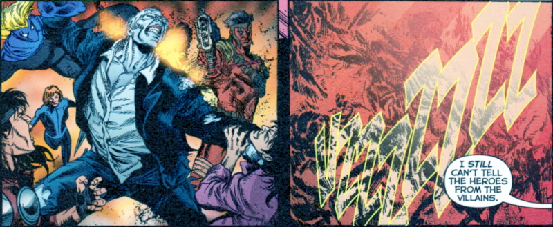Page 4 – Panel 6: Solomon Grundy stands surrounded by several of the New Blood characters that were created during the BLOODLINES crossover in 1993. The characters were almost all commercial failures and, with the exception of one or two – most notably Hitman – faded into obscurity until called up as cannon fodder. Clockwise from bottom left are Nightblade; Razorsharp; Geist; Ballistic and Mongrel.